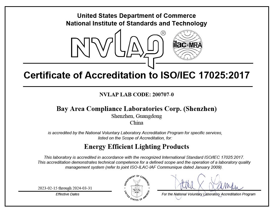 BACL是EPA认可的能源之星检测实验室、发证机构、市场抽检测试实验室,并获得NVLAP (Lab Code: 200707-0), IAS (Accreditation No.: TL-460, TL-749), CNAS (Registration No.: L2408, L5662, L6290, L9963, L11432, IB0343), A2LA (Certificate No.: 3297.01, 3297.02, 3297.03, 4821.01, 4820.01, 4324.01, 4323.01) 等授权和认可,分别在美国、深圳、东莞、昆山等地设有测试场地,具备可同时完成60000只灯的能效老化检测能力,是目前国内规模较大的能效检测实验室。