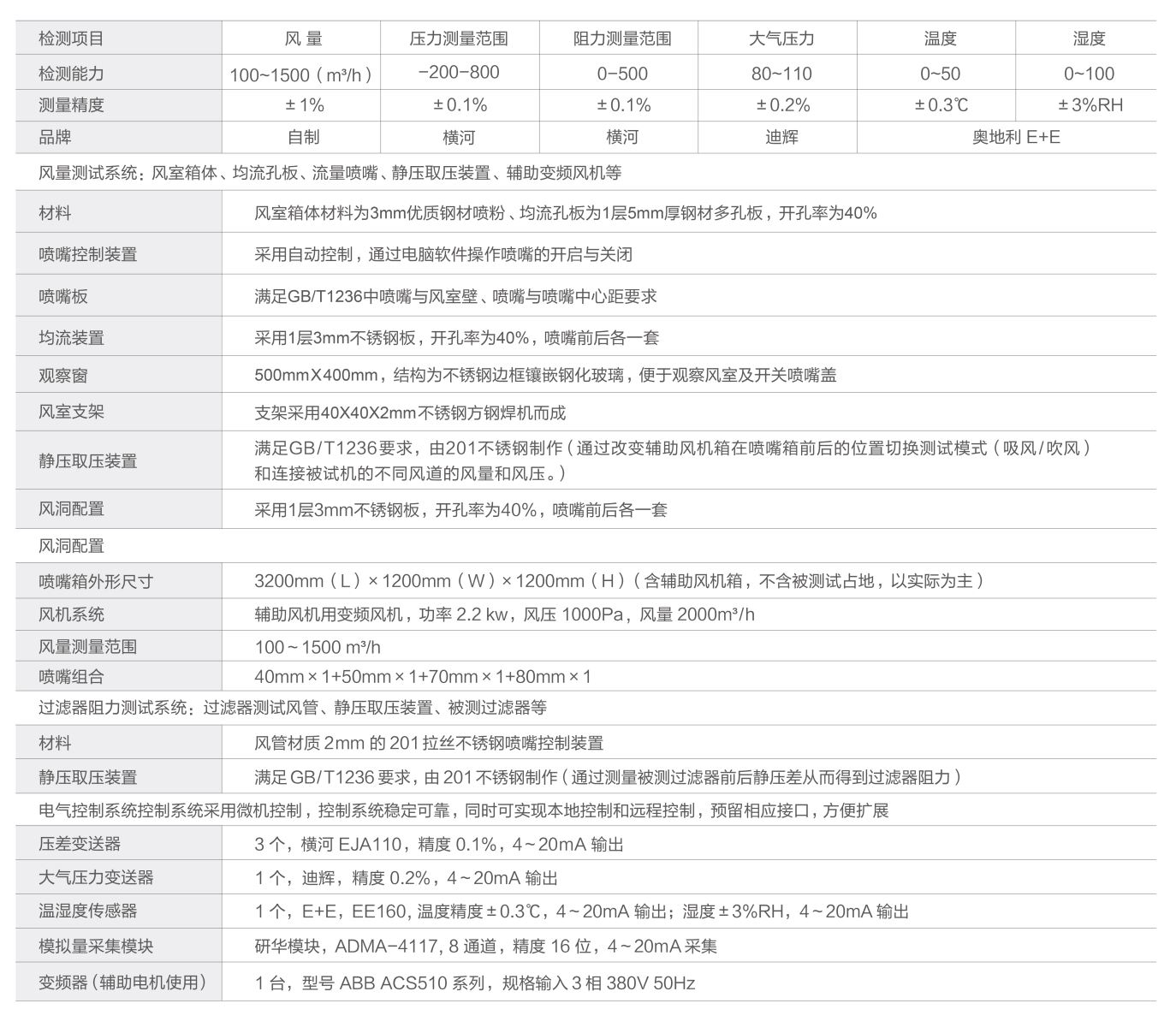 可准确测量带有空调器外壳的风机额定风量、风机盘管、小型风柜轴流风机、贯流风机、离心风机等形式风机的风压-干风量、功率-干风量性能曲线。